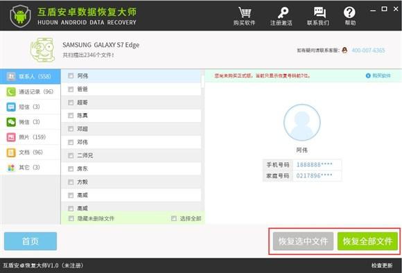 3、手机软件扫描仪进行后,就可以查询到要修复的手机上通信,在手机软件左边点一下“手机通讯录”,点一下“修复全部文件”就可以将手机上中所有的手机通讯录导出来修复到电脑上,还可以启用要修复的手机联系人,点一下“修复选定文档”恢复删除的通迅录文档。