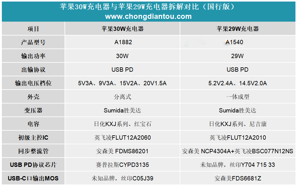 3、两款充电器内部均为多块PCB板组合设计,结构复杂,用料扎实,做工精细。其中初级主控芯片均由英英飞凌提供,不过对于USB-C口的控制器而言,苹果30W充电器使用了赛普拉斯的CYPD3135芯片,而29W充电器用的是一颗未标明品牌的IC,苹果30W充电器较29W充电器的最大升级之处也就在于此。