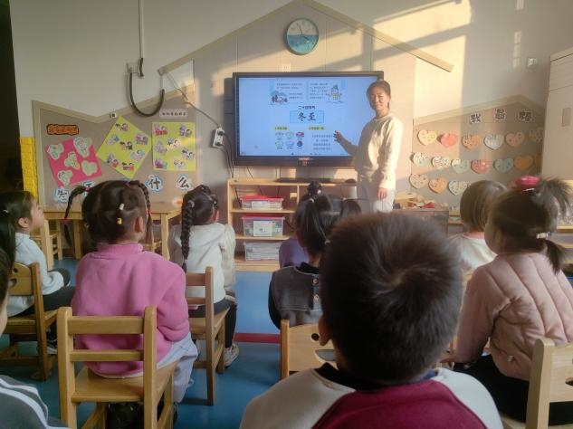 老师用多媒体照片、视频和互动游戏讲述冬至的习俗。“为什么冬至要吃饺子呀?”老师用“冻耳朵”的趣味故事,让孩子们知道传统饮食背后的文化寓意;通过提问“冬天白天短还是长”,引导他们观察季节变化。孩子们听得入神,还会举手分享自己家里过冬至的习惯,在轻松的氛围中了解传统文化。