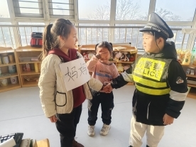 老师带领幼儿一起念交通安全儿歌:“红灯停,绿灯行,警察叔叔指挥清,过马路,左右看,安全规则记心间。”使幼儿知道幼儿:“警察叔叔每天辛苦工作,保护我们的安全,我们见到他们要主动问好,做尊敬警察的好宝宝。”