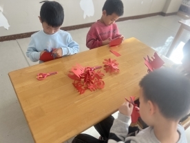 活动伊始,老师结合生动的图片和趣味故事,向孩子们介绍了剪纸这一传统民间艺术,以及窗花在新年装饰中的美好寓意。随后,老师手把手示范折叠彩纸、勾勒线条、裁剪图案的方法,从简单的三角形、圆形,到充满新年气息的“小福字”“小雪花”,一步步耐心讲解。孩子们手握小剪刀,神情专注又认真,小心翼翼地按照步骤创作。彩纸在小手中翻转、裁剪,不一会儿,一张张普通的彩纸就变成了形态各异的剪纸作品。活动室里洋溢着欢乐的氛围,孩子们拿着自己的作品互相展示、分享喜悦,稚嫩的脸上满是成就感。