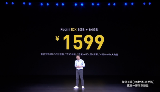 发布会上,Redmi产品总监王腾正式宣布,Redmi 10X首发天玑820 5G处理器,由Redmi与MediaTek深度合作优化,安兔兔跑分达41万分以上。卢伟冰也在发布会上表示,这款天玑820 5G处理器在性能上可以比肩麒麟985。
